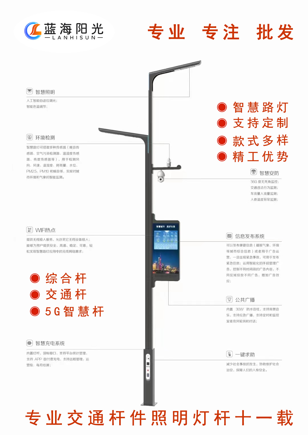 歡迎來到青島智慧LED路燈桿制造商-藍海陽光,我們致力于打造城市照明的新潮流。無論是改造老舊路燈還是建設新的照明項目,我們擁有豐富的經驗和專業知識,為您提供卓越的解決方案。 我們的智慧LED路燈桿將為您的城市帶來革命性的變化。首先,我們采用最先進的LED技術,提供高效節能的照明效果,使您的城市更環保、更節能。LED光源的持久壽